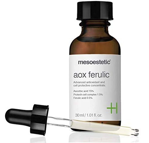 AOX Ferulic firmy Mesoestetic - to serum silnie odmładzające i ochronne. Zapewnia biologiczną osłonę przed szkodliwym promieniowaniem UVB i UVA. Dodatkowo ma działanie antyoksydacyjne uszkadzając komórki oksydacyjne chroniąc jednocześnie fibroblasty. Kwas ferulowy 0,5% ochrania tkanki i komórki przed szkodliwym wpływem promieniowania, a także neutralizuje powstawanie wolnych rodników. Protech-Cell Complex 1,5% to ekskluzywny kompleks z witaminą E, który ochrania lipidy naskórkowe jak również hamuje działanie wolnych rodników.