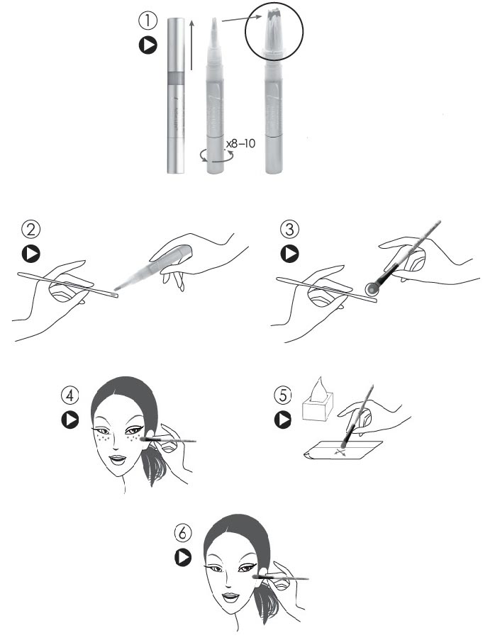 Aplikować na skórę po uprzednim zastosowaniu wybranego pudru, w przypadku występowania zmarszczek, należy eliminować ilość pudru. Stosując produkt po raz pierwszy należy odwrócić aplikatur z pędzelkiem do dołu i przekręcić produkt 360 stopni aż do uzyskania pierwszych ilości korektora na pędzelku. Do stosowania na twarzy wskazane użycie pędzla Camuflage. Dla osób tendencją występowania obrzęków wokół powiek zalecane jest stosowanie produktu na noc w celach zapobiegawczych.