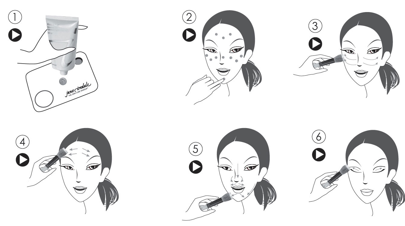 Na umytą skórę przy pomocy Magic Mitt™ lub innego zmywacza nałożyć krem opuszkami palców na części czoła, policzków, nosa i brody, a następnie rozłożyć pędzelkiem od środkowej części twarzy na boki. Dla utrwalenia makijażu warto spryskać wybraną wodą: D2O™, Balance lub Pommisst™.