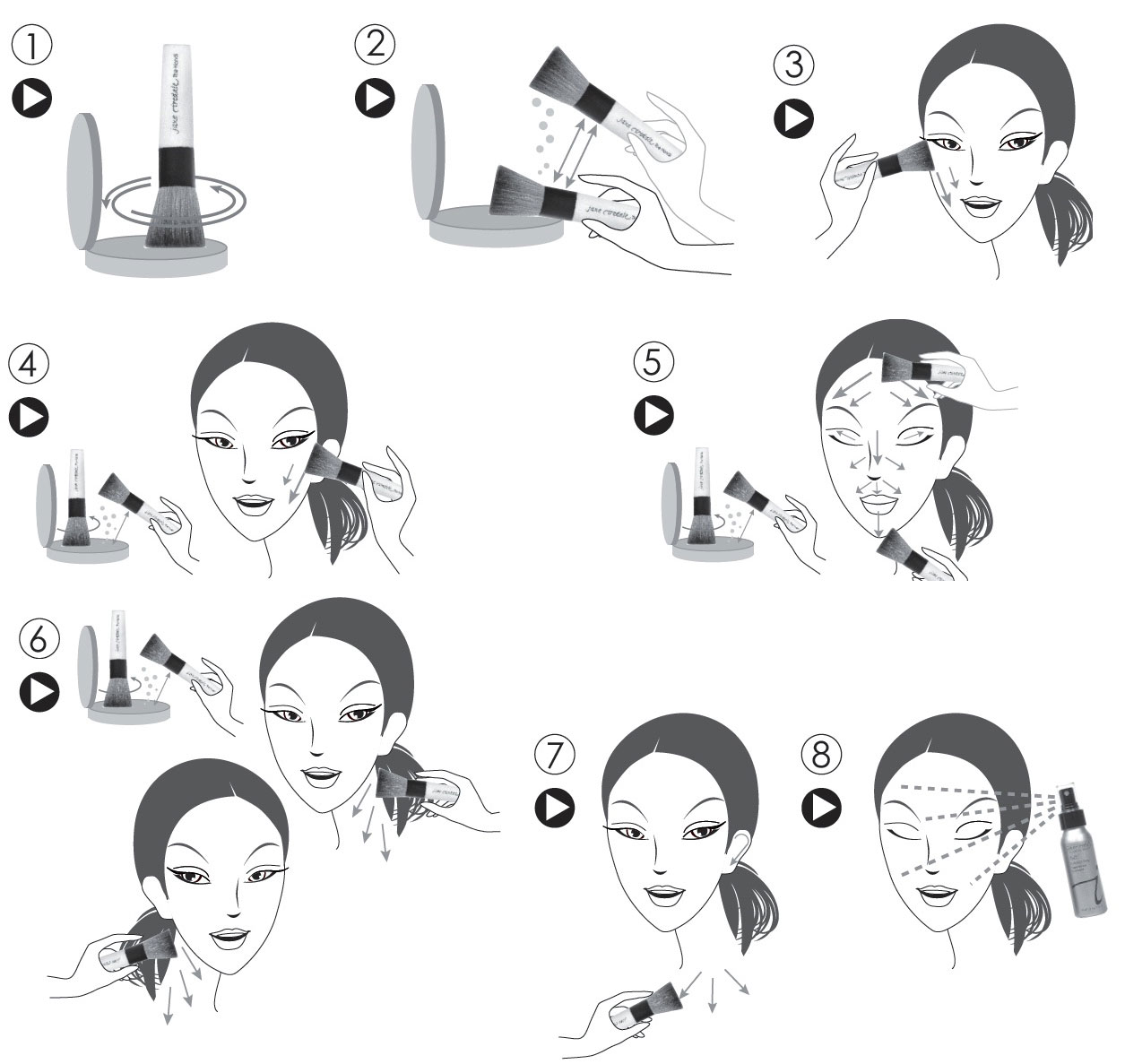 Po nałożeniu wybranego pudru mineralnego, umieścić pędzelek Handi w pudrze stosując ruch kolisty, strzepnąć nadmiar pudru na wkład i nakładać od zewnętrznych krawędzi twarzy ruchami w dół, a następnie od centralnej części twarzy w kierunku na boki. Spryskać wodą D2O, Balance lub Pommist w celu utrwalenia makijażu.