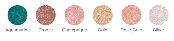Gold, Silver, Bronze, Champagne, Ingredients: Mica, 24-Karat Gold Leaf. May Contain: Iron Oxides. Green Ingredients: Mica, 24-Karat Gold Leaf. May contain: Iron Oxides, Chromium Oxide Greens. Rose Ingredients: Mica, Carmine. May Contain: Iron Oxides. Aquamarine Ingredient: Mica. May Contain: Iron Oxides, Chromium Oxide Greens.