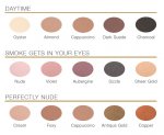 Pięć odcieni: Nude (jasny beż, orzech), Violet (ciemny fiolet), Aubergine (oberżyna), Sizale (przejrzysty grafit) i Sheer Gold (przejrzysty złoty) stanowi doskonały zestaw kolorystyczny na każdą okazję. Jasne kolory doskonale sprawdzą się jako codzienny makijaż biznesowy, ciemne natomiast uwypuklą piękno twarzy na wieczorne wyjście.