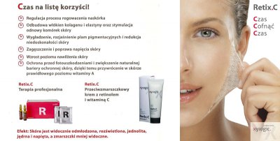 Retix C to ntensywna terapia anti-aging wykorzystujaca synergistyczne działanie 3 składników: Retinol 2% + witamina C 8% + antyoksydanty 30%. W wyniku działania tej wyjątkowo skutecznej mieszanki składników aktywnych natępuje szereg procesów odmładzających i chroniących skórę przed procesami starzenia: regulacja procesu rogowacenia naskórka, odbudowa włókien kolagenu, elastyny i GAG, stymulacja odnowy komórek skóry, wygładzenie, rozjaśnienie plam pigmentacyjnych i redukcja niedoskonałości skóry, agęszczenie i poprawa napięcia skóry, zwiększenie poziomu nawilżenia skóry, dzięki ograniczeniu przeznaskórkowej utraty wody z naskórka, ochrona przed fotouszkodzeniami i zwiększenie naturalnej bariery ochronnej skóry, dzięki przywróceniu w skórze prawidłowego poziomu witaminy A. Po zabiegu skóra jest widocznie odmłodzona, rozświetlona, jednolita, jędrna i napięta a zmarszczki mniej widoczne.