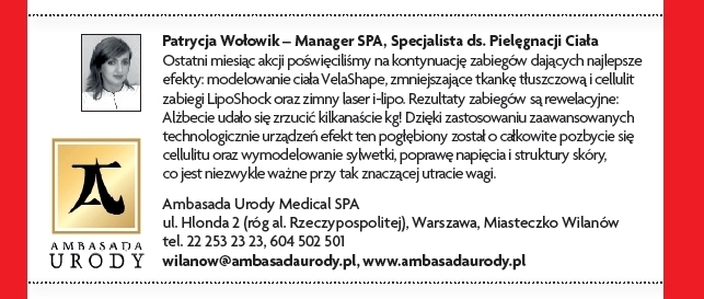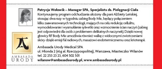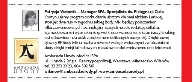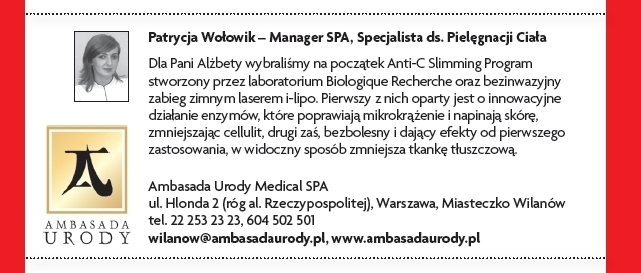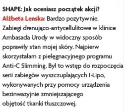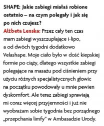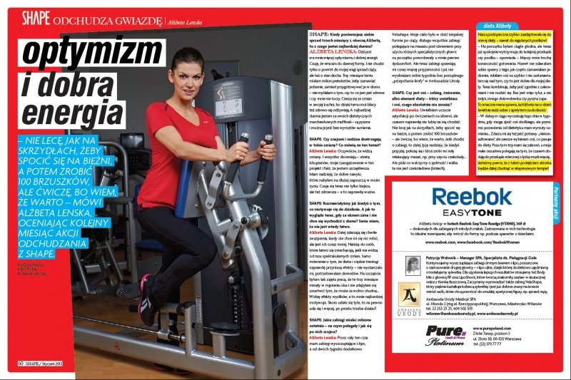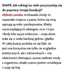Przez cztery miesiące we współpracy z magazynem „Shape” prowadziliśmy akcję odchudzania gwiazdy teatralnej i telewizyjnej, Alżbety Lenskiej, która po urodzeniu córeczki nie była zadowolona ze swego wyglądu, kilogramów, które nie zniknęły po ciąży oraz bardzo widocznego cellulitu.
